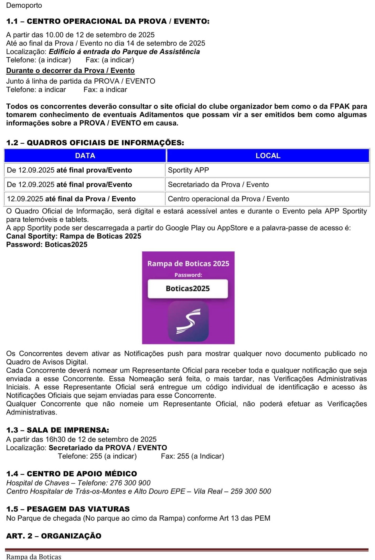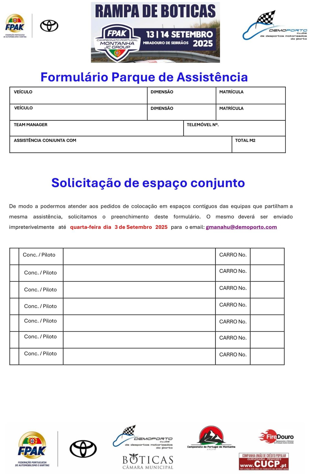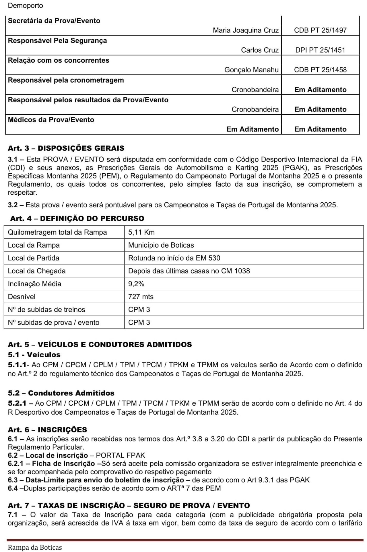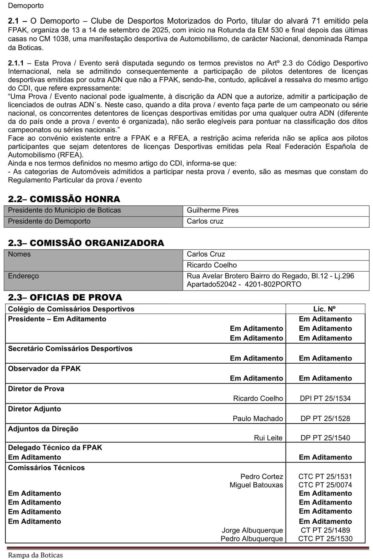 Lista de Inscritos + Constituição CCD N.º 1 + Aditamento N.º 1 + Regulamento Particular + Formulário Parque de Assistência + Parque Assistência Layout
